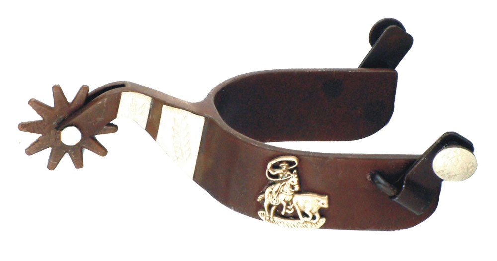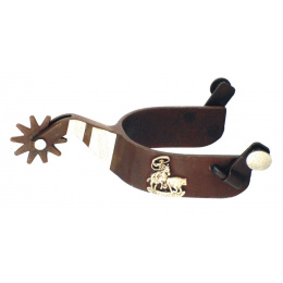 Hnědé ocelové show ostruhy s ručně rytým stříbrným zdobením s motivem "roper". Kolečko s osmi paprsky.