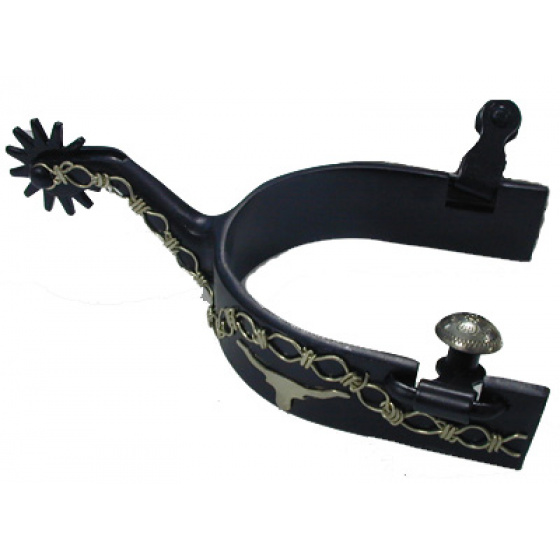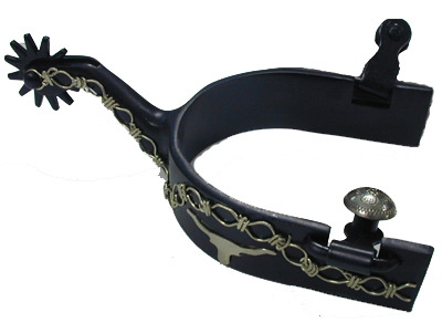 Černé ocelové ostruhy s ručně rytým stříbrným zdobením. Kolečko s dvanácti paprsky.