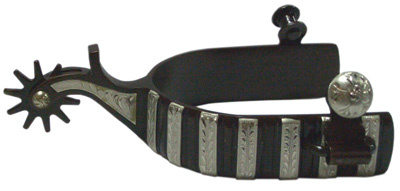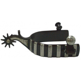 Hnědé ocelové ostruhy s ručně rytým stříbrným zdobením. Kolečko s deseti paprsky.