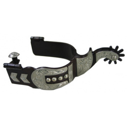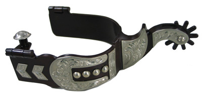 Hnědé ocelové ostruhy s ručně rytým stříbrným zdobením. Kolečko s deseti paprsky.