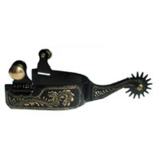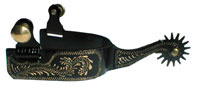 Černé ocelové show ostruhy s ručně rytým stříbrným zdobením. Kolečko s šestnácti paprsky.