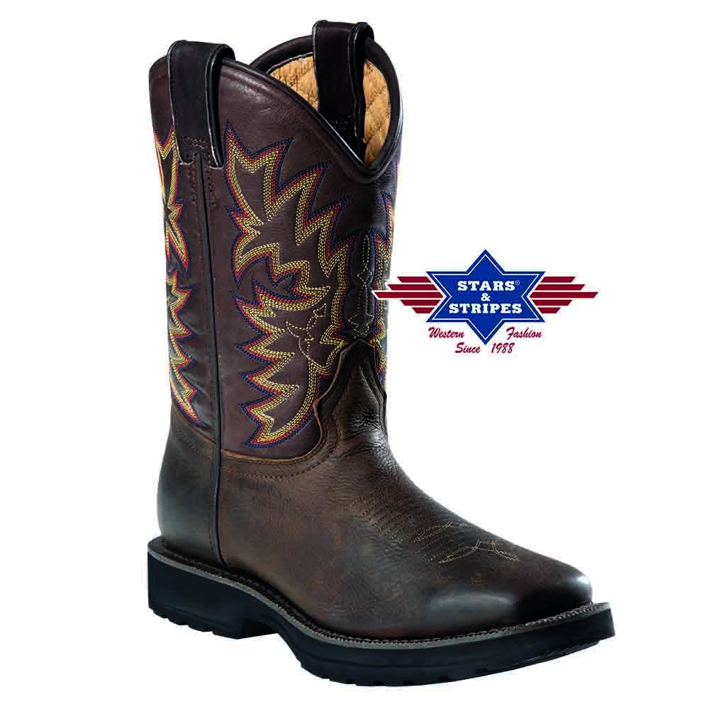 Robustní westernové pracovní boty zdobené propracovanou výšivkou. Díky polstrované stélce a gumové podrážce jsou boty obzvláště pohodlné. Jsou vyráběny ručně z velmi kvalitní hovězí kůže tradiční mexickou metodou. Pevná pryžová podrážka odolná kyselinám a olejům je vyrobena na "hight-quality" Goodyear konstrukci. Boty mají koženou podšívku, všechny materiály jsou kvalitní přírodní kůže.