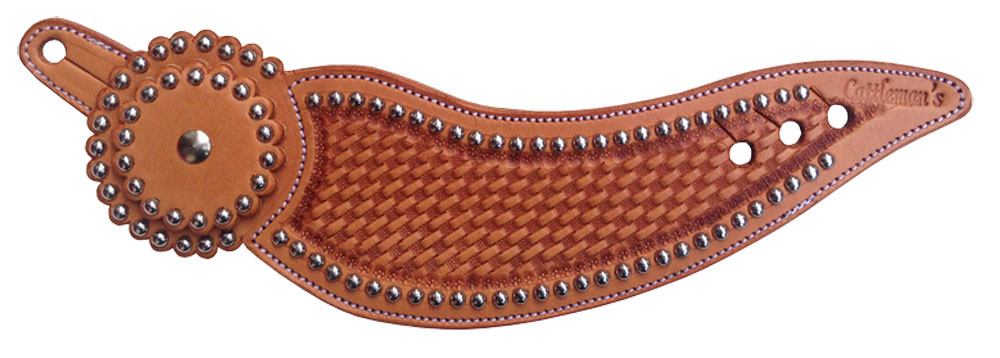 Westernové kožené řemínky k ostruhám "Wickett & Craig" zdobené basketem, stříbrnými nýtky a koženým končakem, obšité a podložené telecí kůží. Dobytkářská značka v provedení "holubí křídlo", nerezové kování.