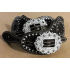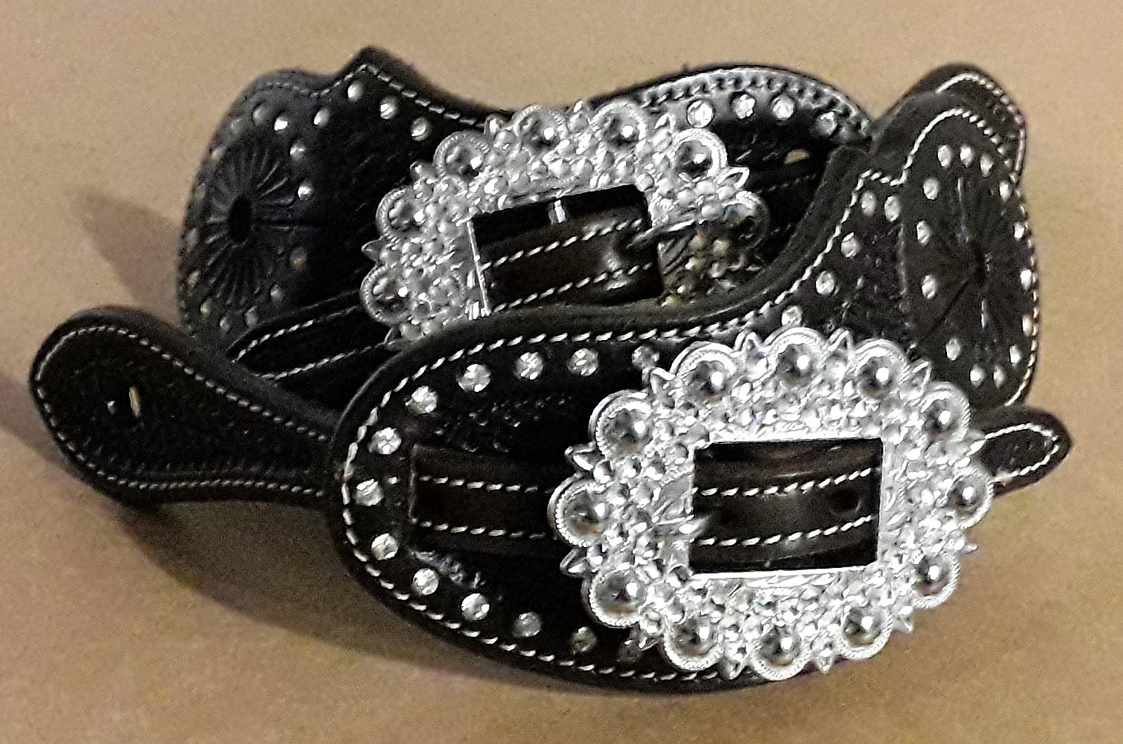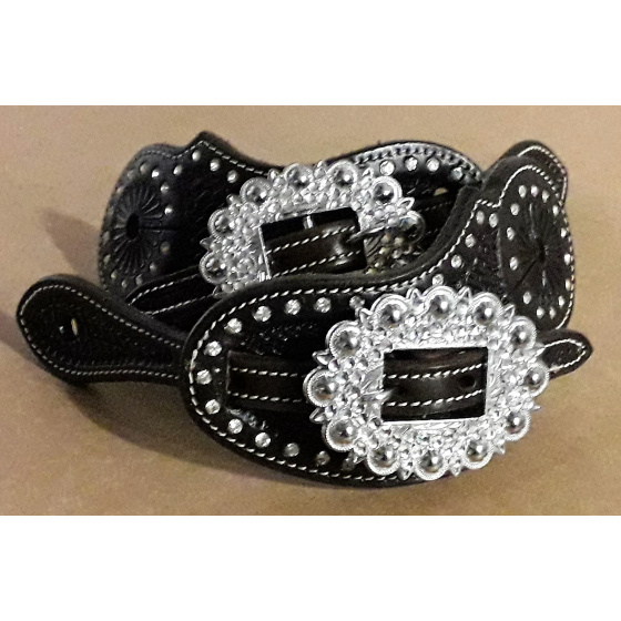 Westernové kožené řemínky k ostruhám zdobené motivy květů a bílými kamínky, stříbrná přezka s kamínky.