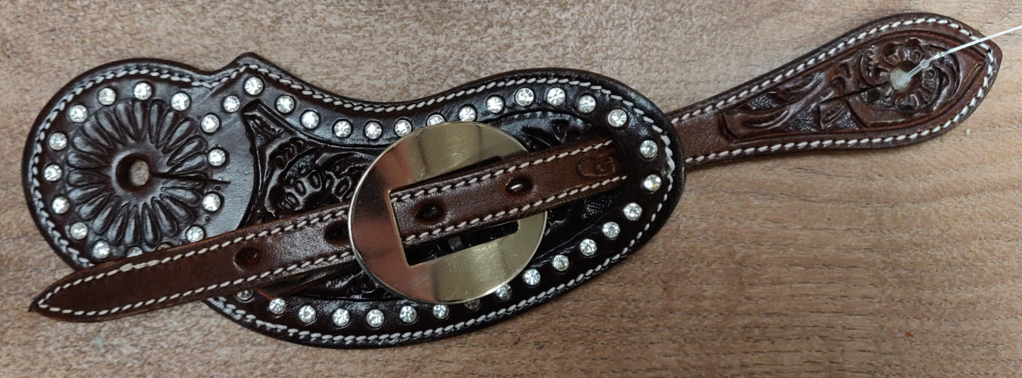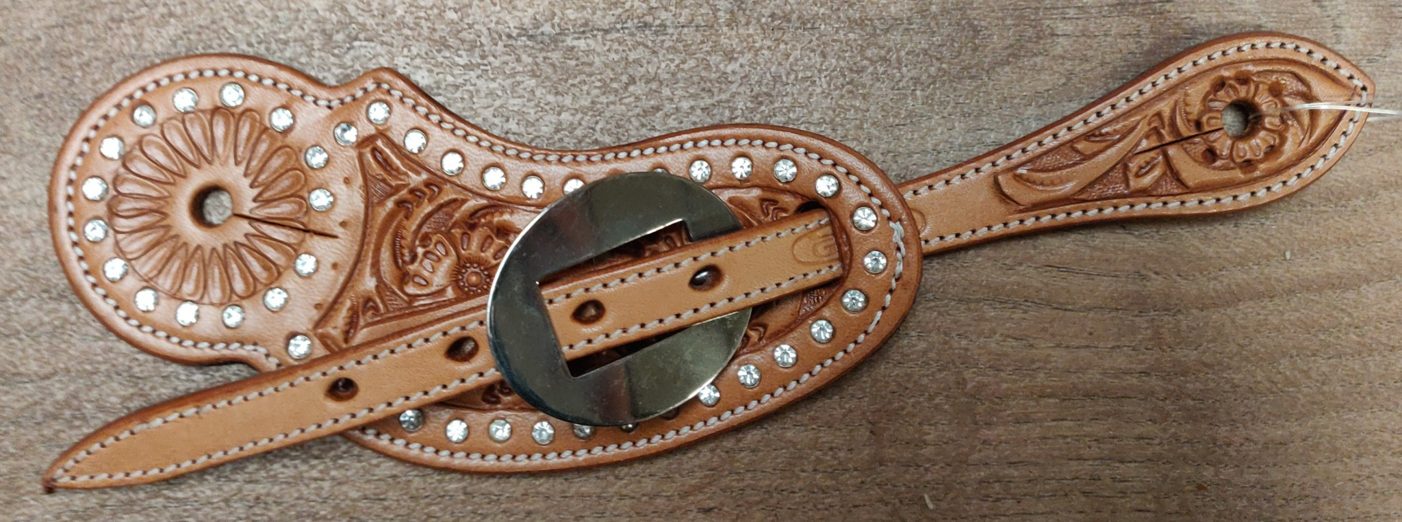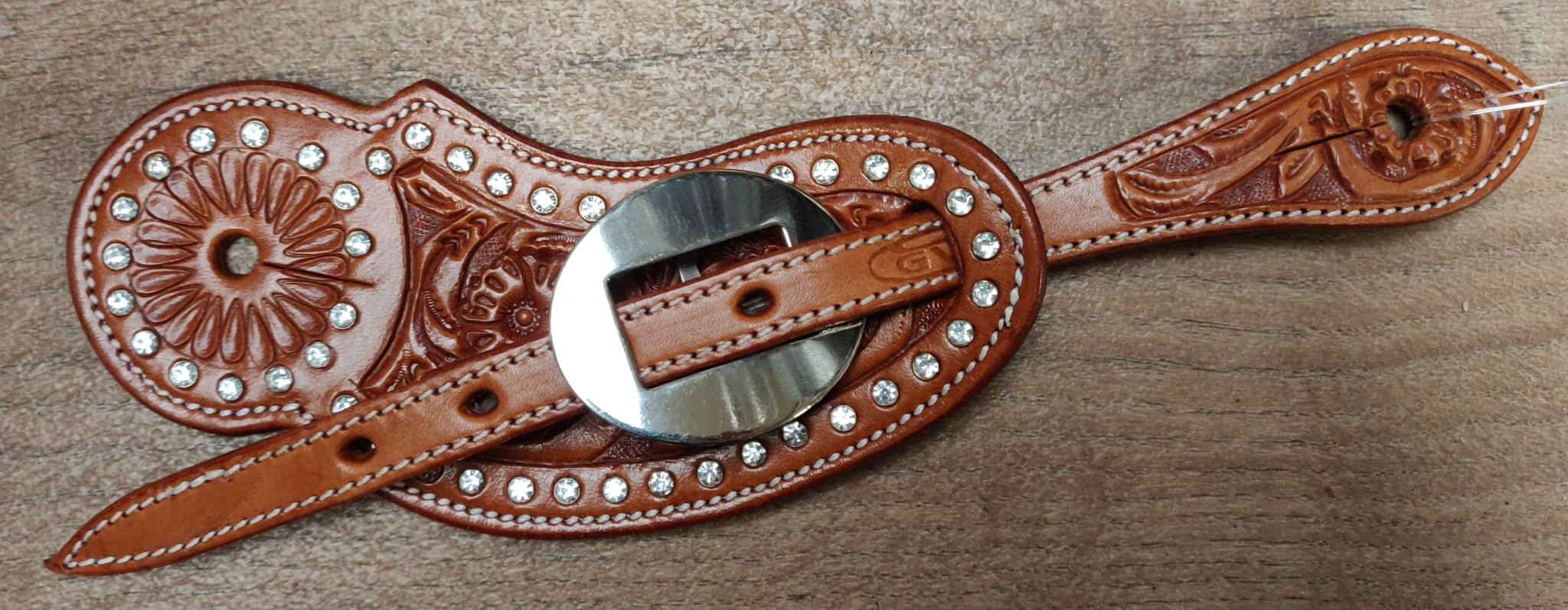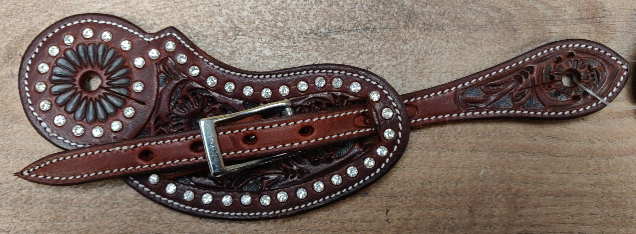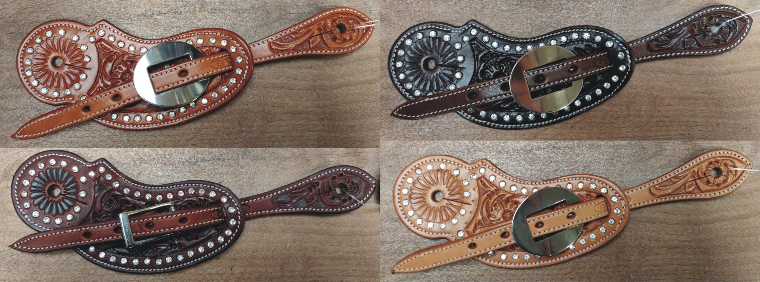 Westernové kožené řemínky k ostruhám z vysokojakostní kůže zdobené květinovým vzorem a bílými kamínky, obšité a podložené telecí kůží. Nerezové kování.
