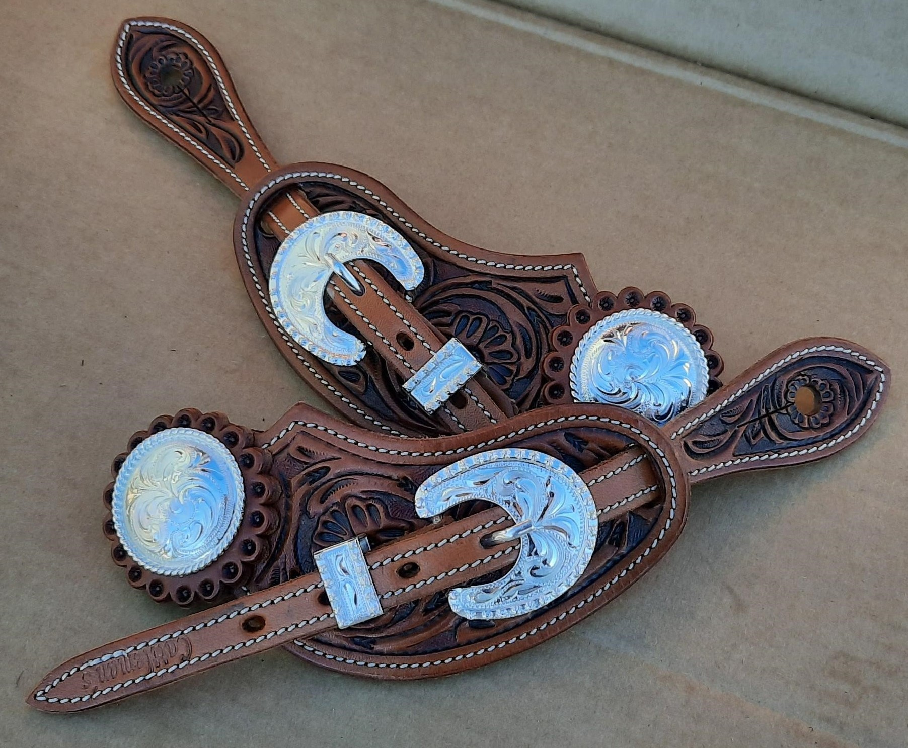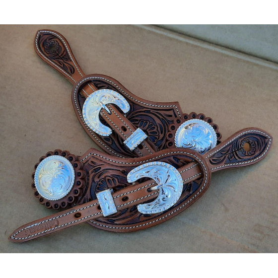 Westernové kožené řemínky k ostruhám z vysokojakostní kůže zdobené květinovým vzorem, obšité a podložené telecí kůží. Ozdobná stříbrná přezka "Yuma Berry" a končak "Rope".