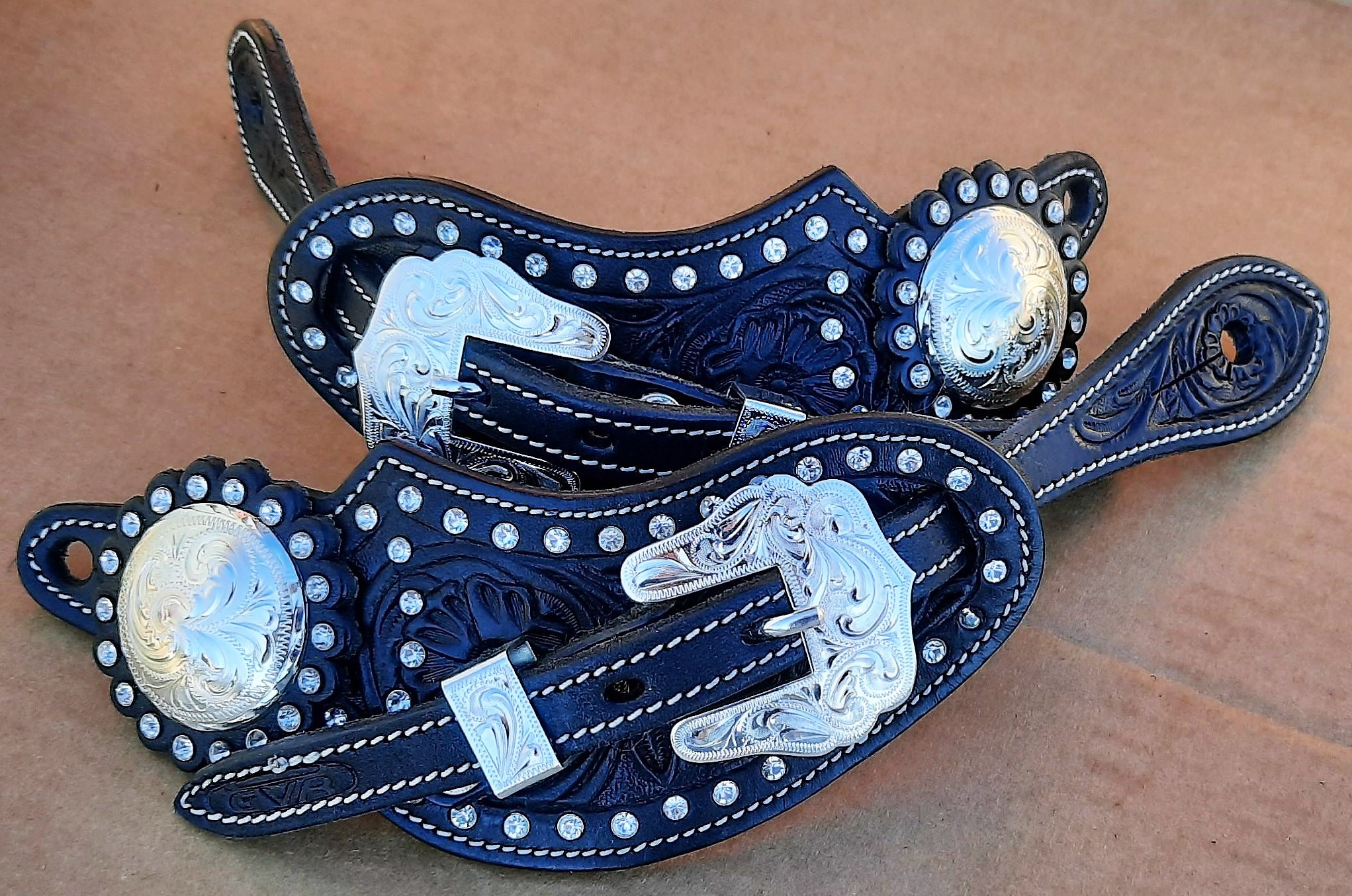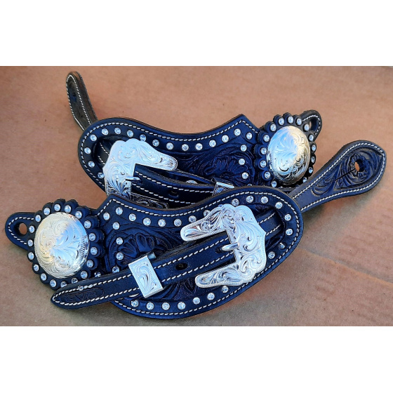Westernové kožené řemínky k ostruhám z vysokojakostní kůže zdobené květinovým vzorem a bílými kamínky, obšité a podložené telecí kůží. Ozdobná stříbrná přezka "Scottsdale" a končak "Oklahoma".