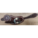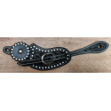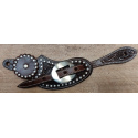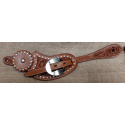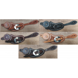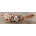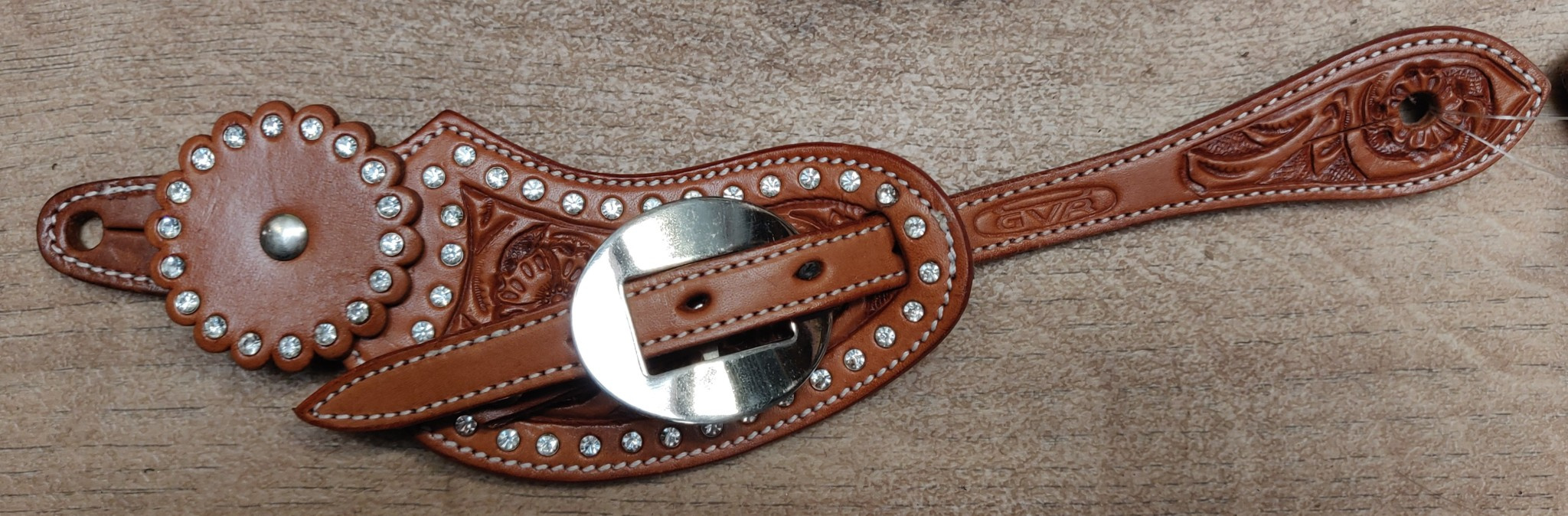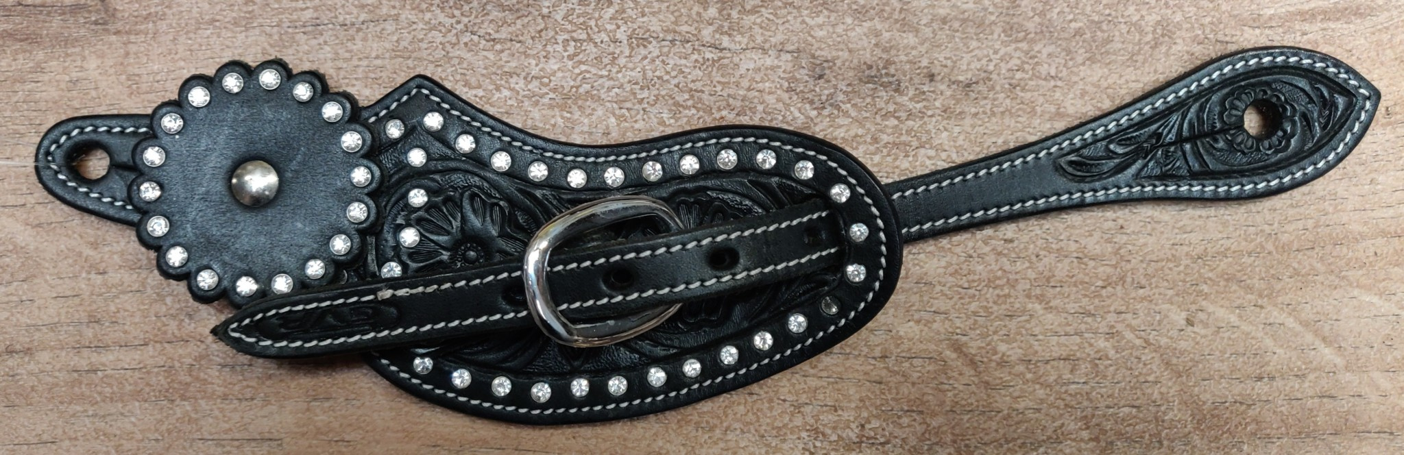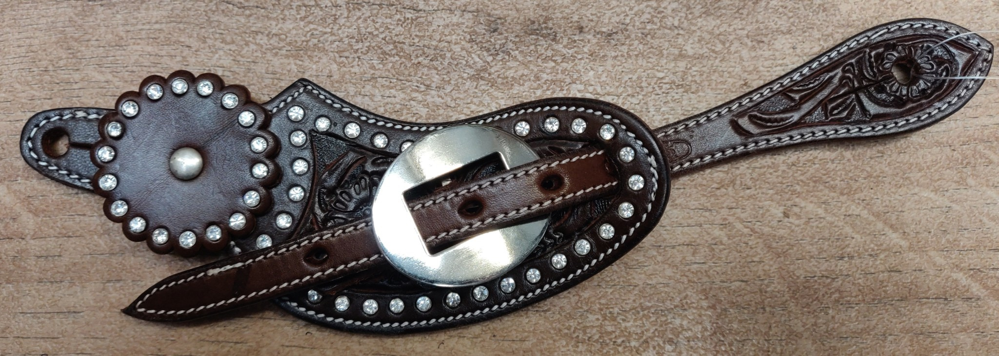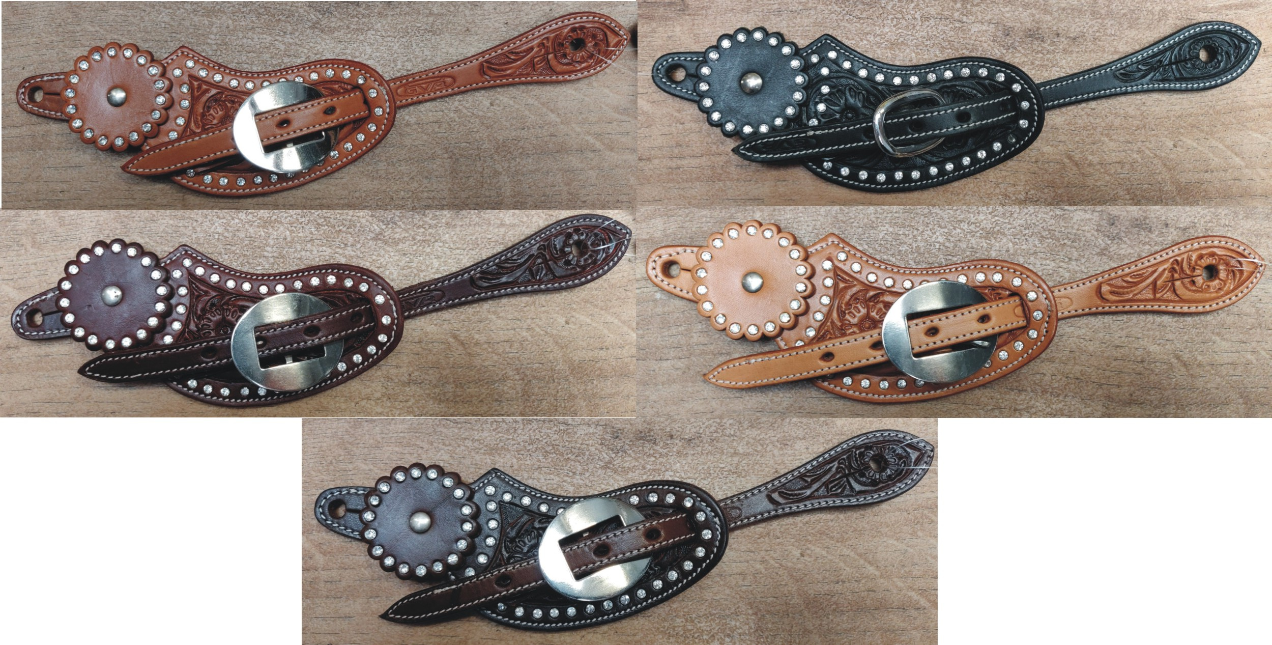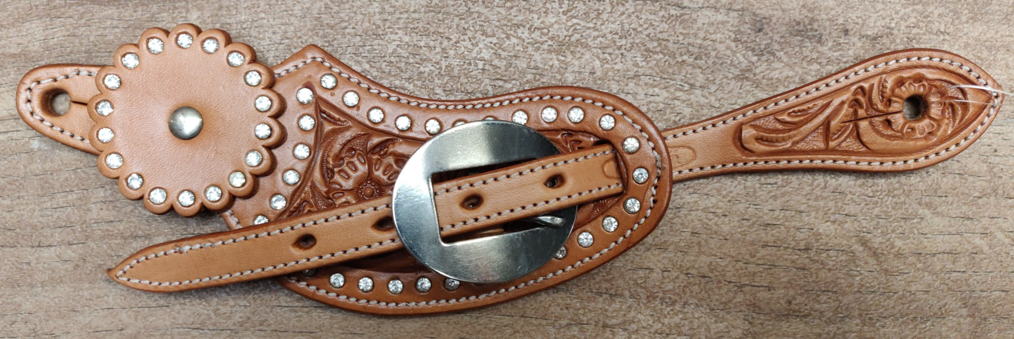 Westernové kožené řemínky k ostruhám z vysokojakostní kůže zdobené květinovým vzorem, bílými kamínky a koženým končakem, obšité a podložené telecí kůží. Nerezové kování.