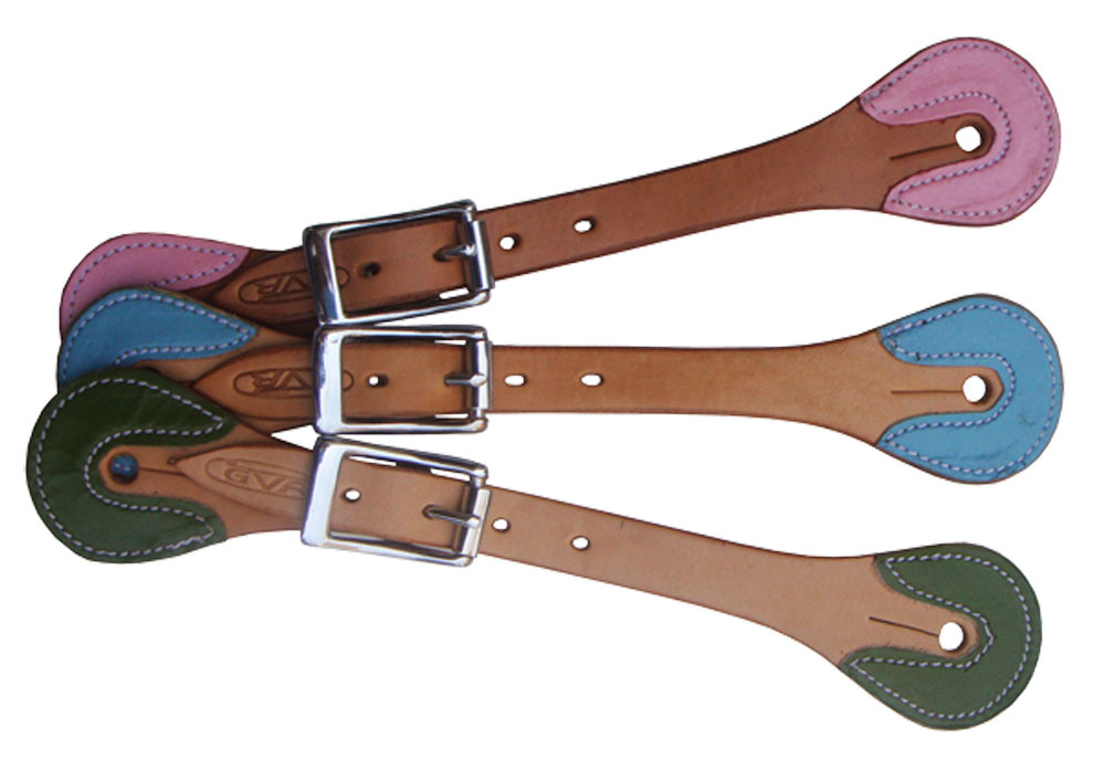 Hladké westernové kožené řemínky k ostruhám z vysokojakostní kůže zdobené barevnou kůží, obšité a podložené telecí kůží. Nerezové kování.