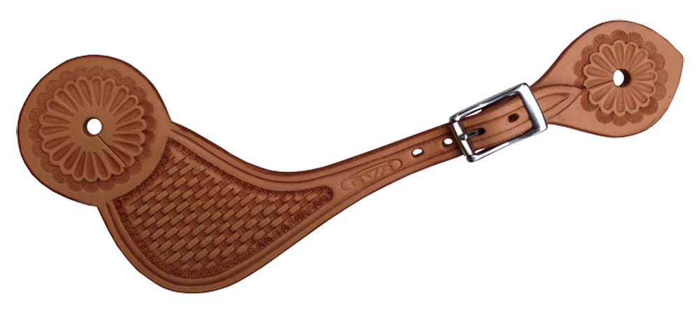 Westernové kožené řemínky k ostruhám z vysokojakostní kůže zdobené jemným basketem. Nerezové kování.