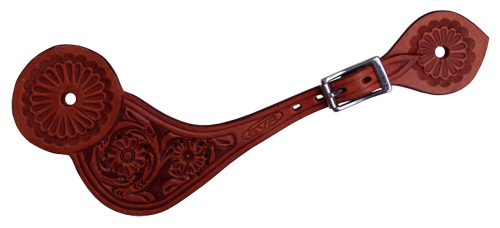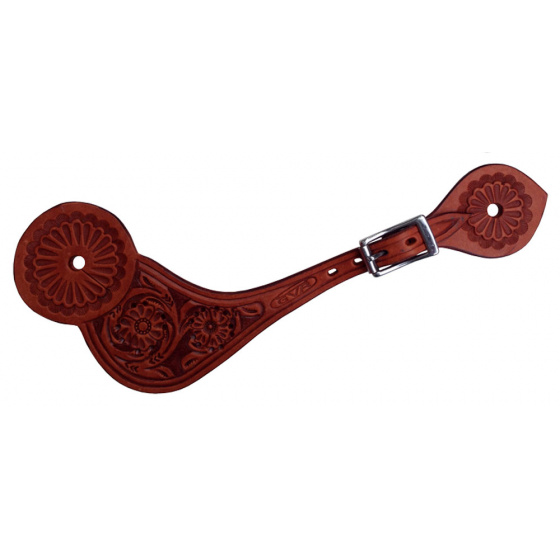Westernové kožené řemínky k ostruhám z vysokojakostní kůže zdobené květinovým vzorem. Nerezové kování.