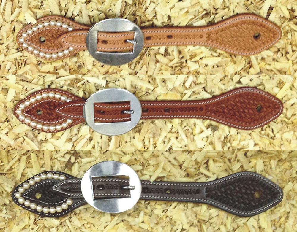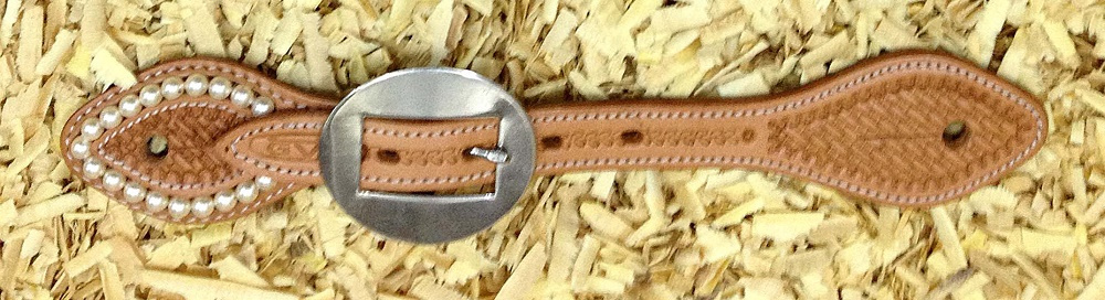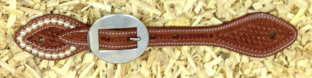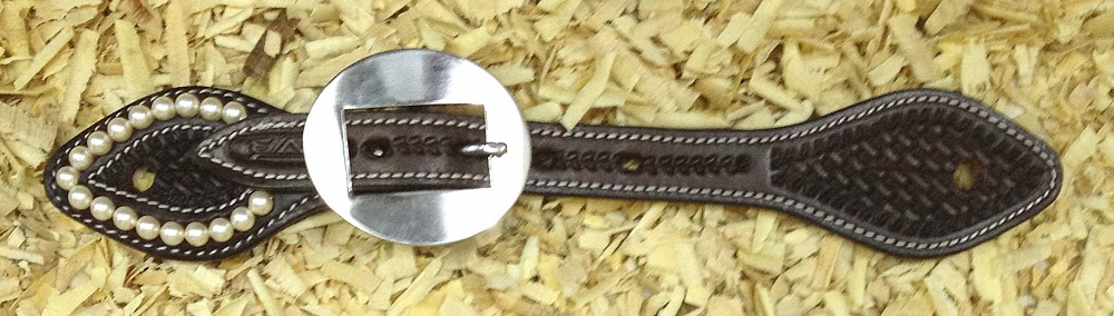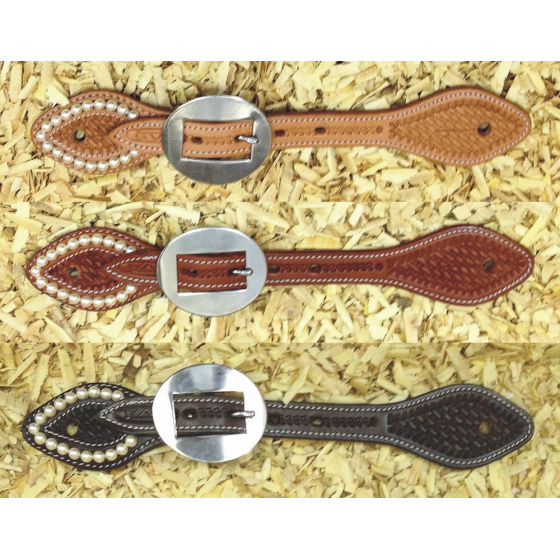 Westernové kožené řemínky k ostruhám zdobené jemným basketem a perlami Swarowski, obšité a podložené telecí kůží, nerezové kování.