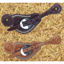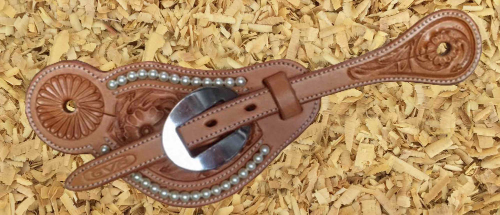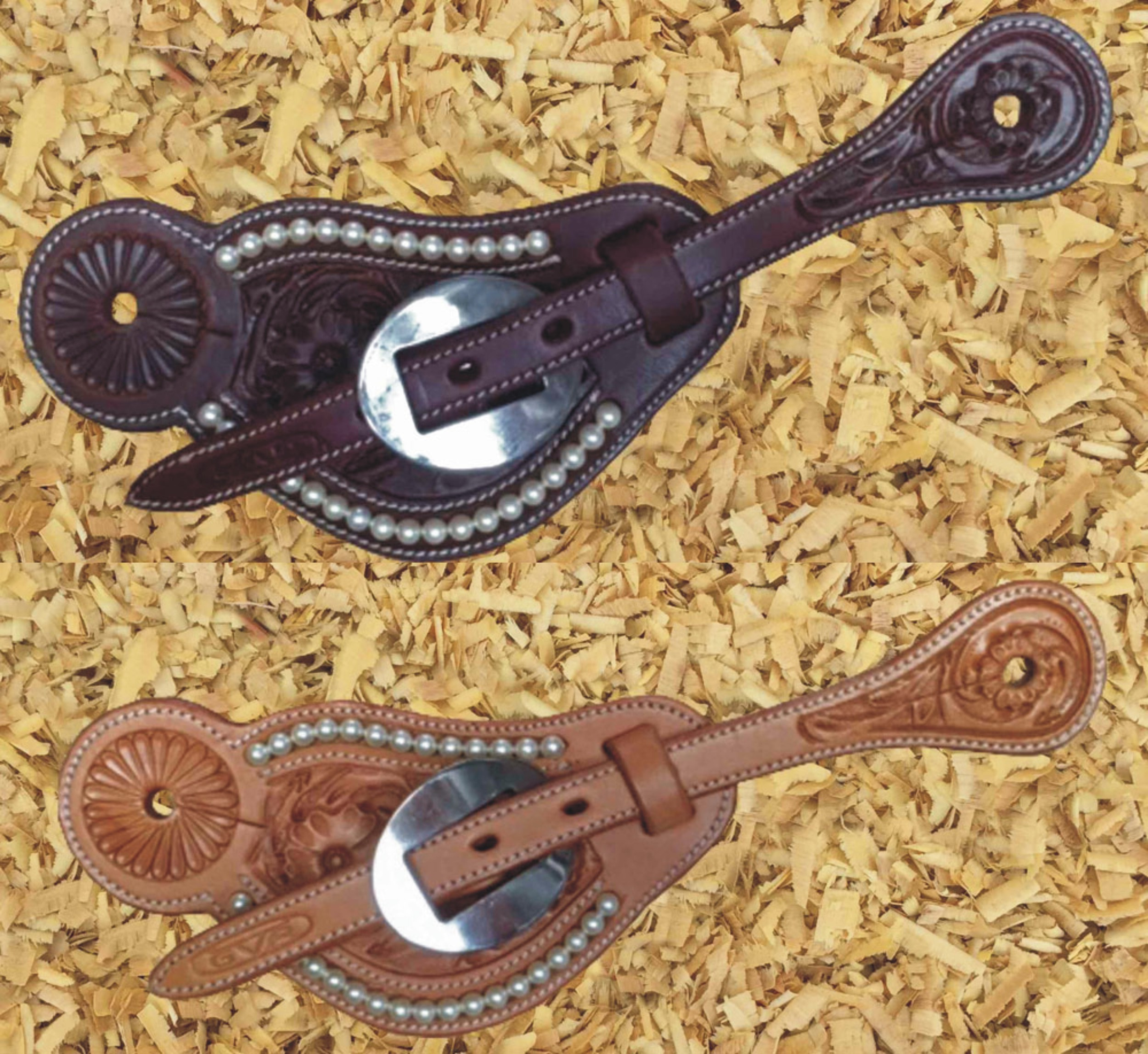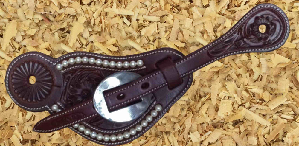 Westernové kožené řemínky k ostruhám zdobené květinovým vzorem a perlami Swarowski, obšité a podložené telecí kůží, nerezové kování.