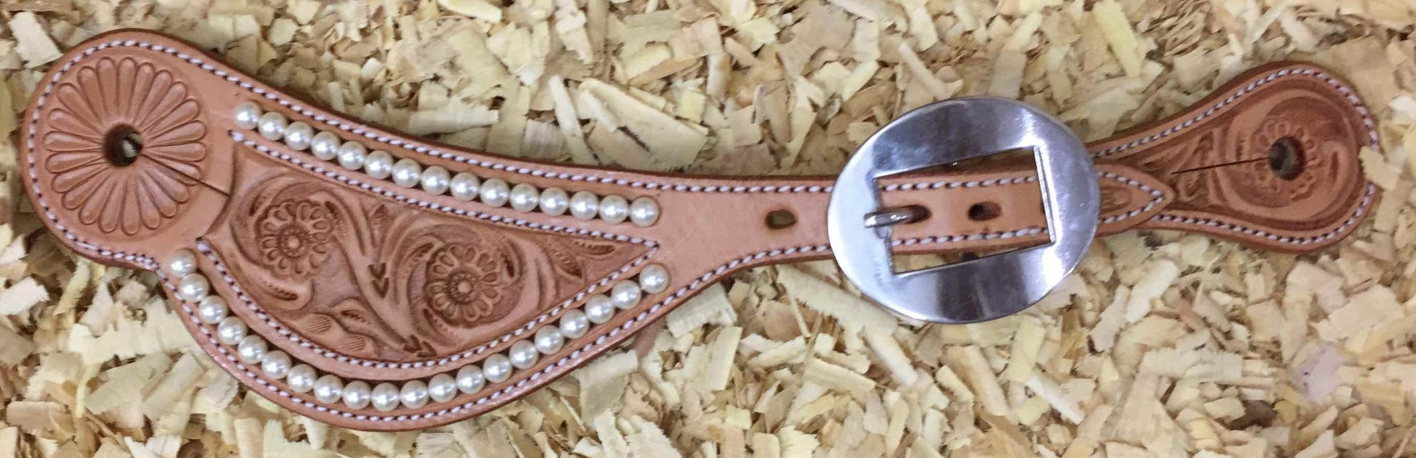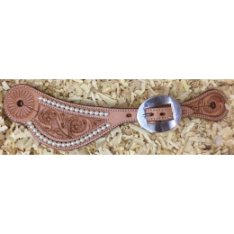 Westernové kožené řemínky k ostruhám zdobené květinovým vzorem a perlami Swarowski, obšité a podložené telecí kůží, nerezové kování.