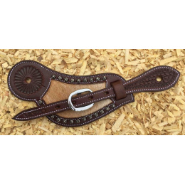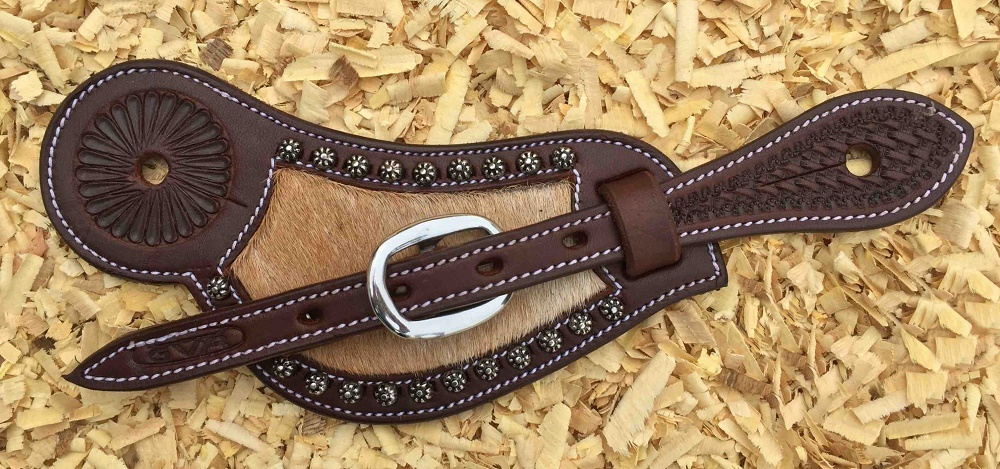 Westernové kožené řemínky k ostruhám zdobené chlupatou hovězí kůží a nýtky po obvodu, obšité a podložené telecí kůží. Nerezové kování.