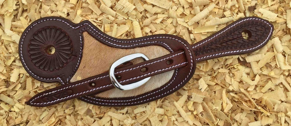 Westernové kožené řemínky k ostruhám zdobené chlupatou hovězí kůží, obšité a podložené telecí kůží. Nerezové kování.