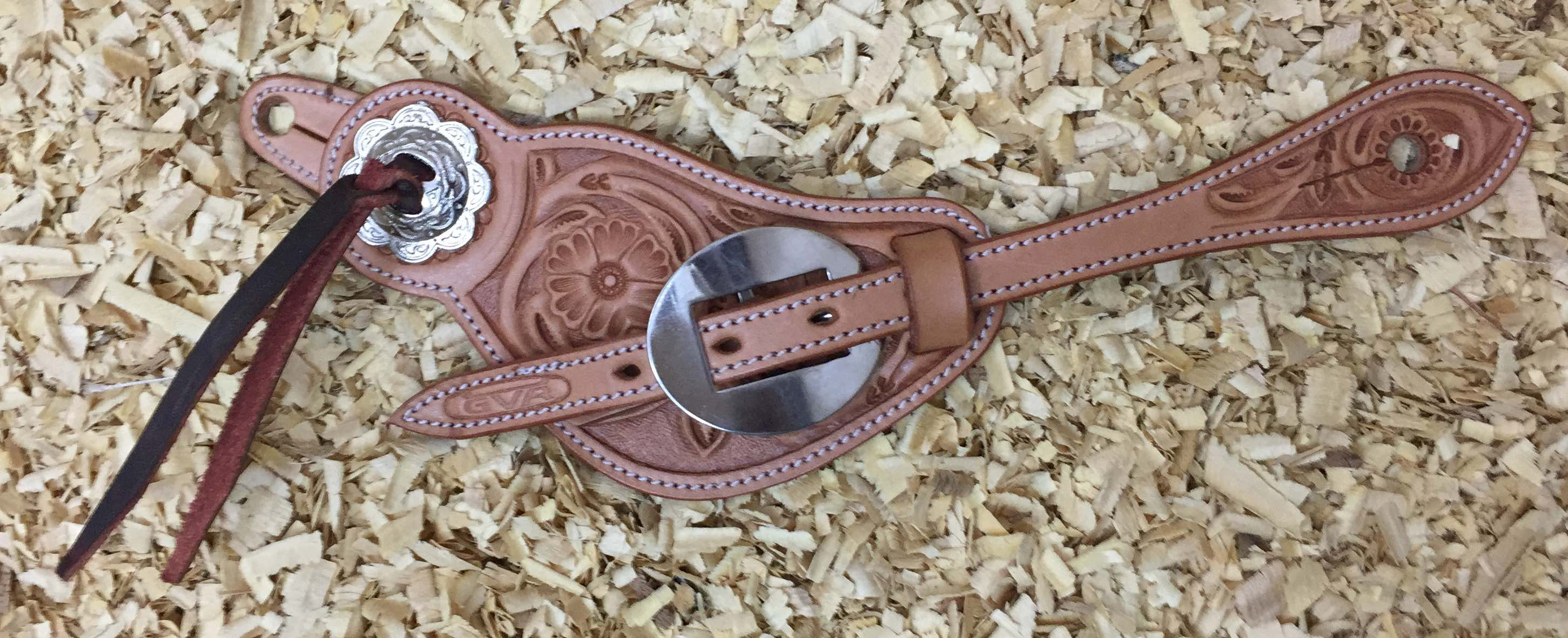 Westernové kožené řemínky k ostruhám zdobené květinovým vzorem a stříbrným končakem, obšité a podložené telecí kůží. Nerezové kování.