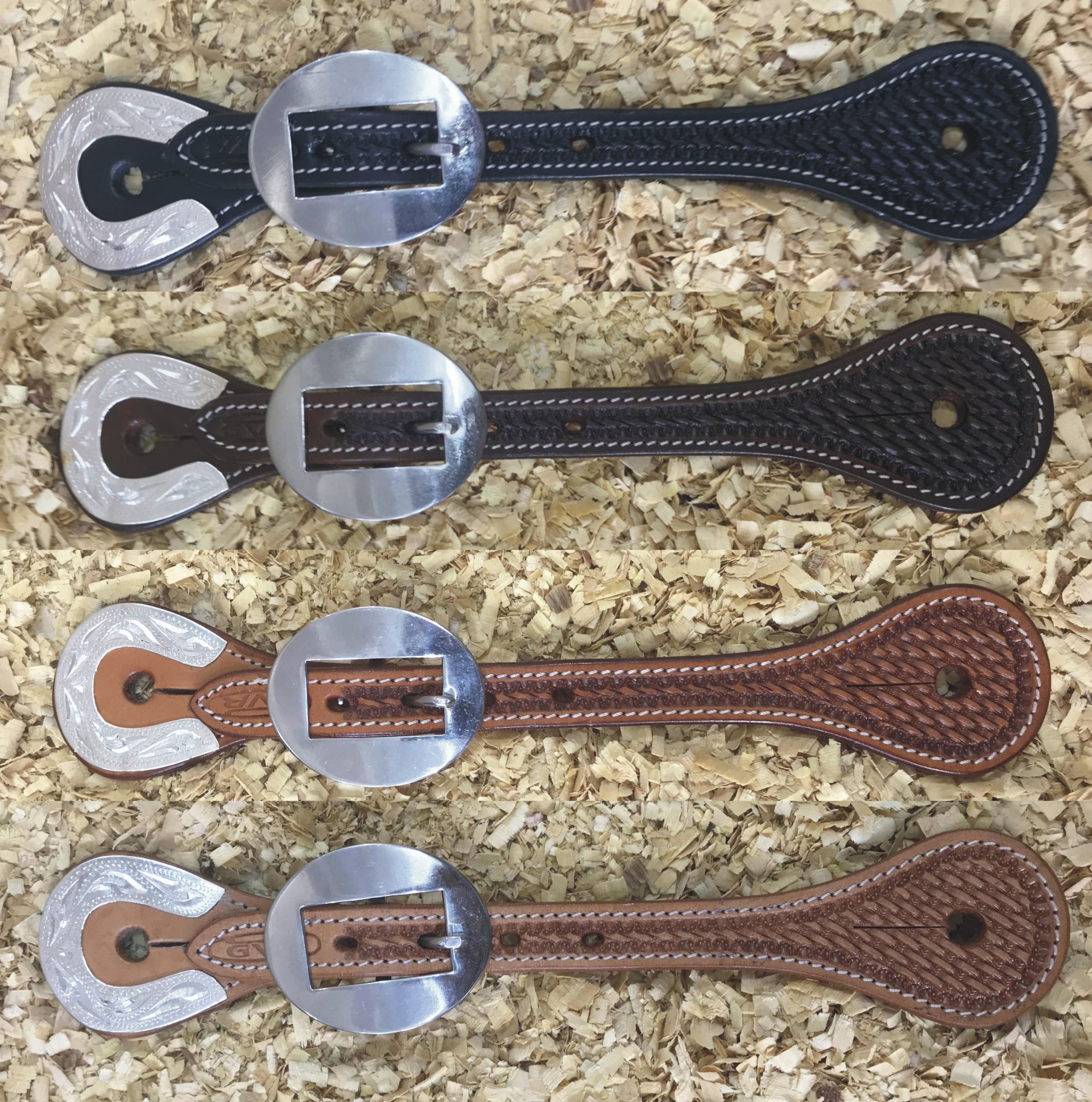 Westernové kožené řemínky k ostruhám zdobené stříbrným rytým lemem a basketem. Nerezové kování.