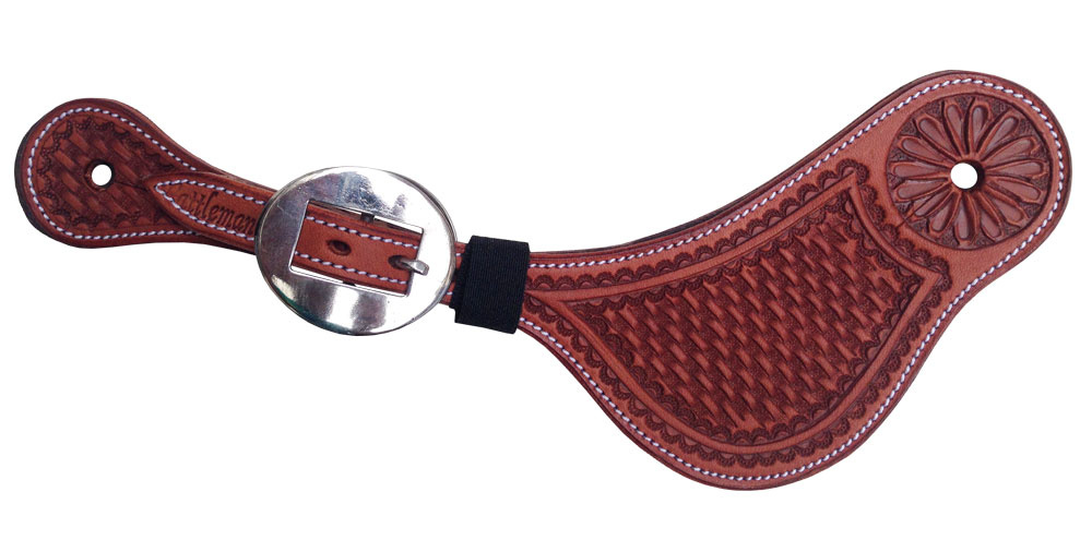 Westernové kožené řemínky k ostruhám z vysokojakostní kůže zdobené jemným basketem, obšité a podložené telecí kůží. Nerezové kování.