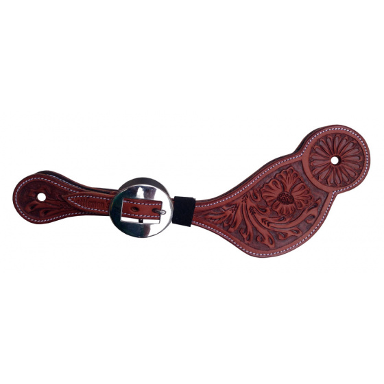 Westernové kožené řemínky k ostruhám z vysokojakostní kůže zdobené květinovým vzorem, obšité a podložené telecí kůží. Nerezové kování.