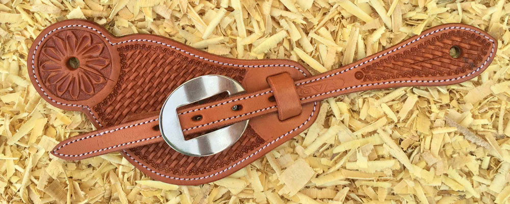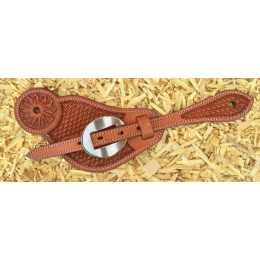 Westernové kožené řemínky k ostruhám z vysokojakostní kůže zdobené jemným basketem, obšité a podložené telecí kůží. Nerezové kování.