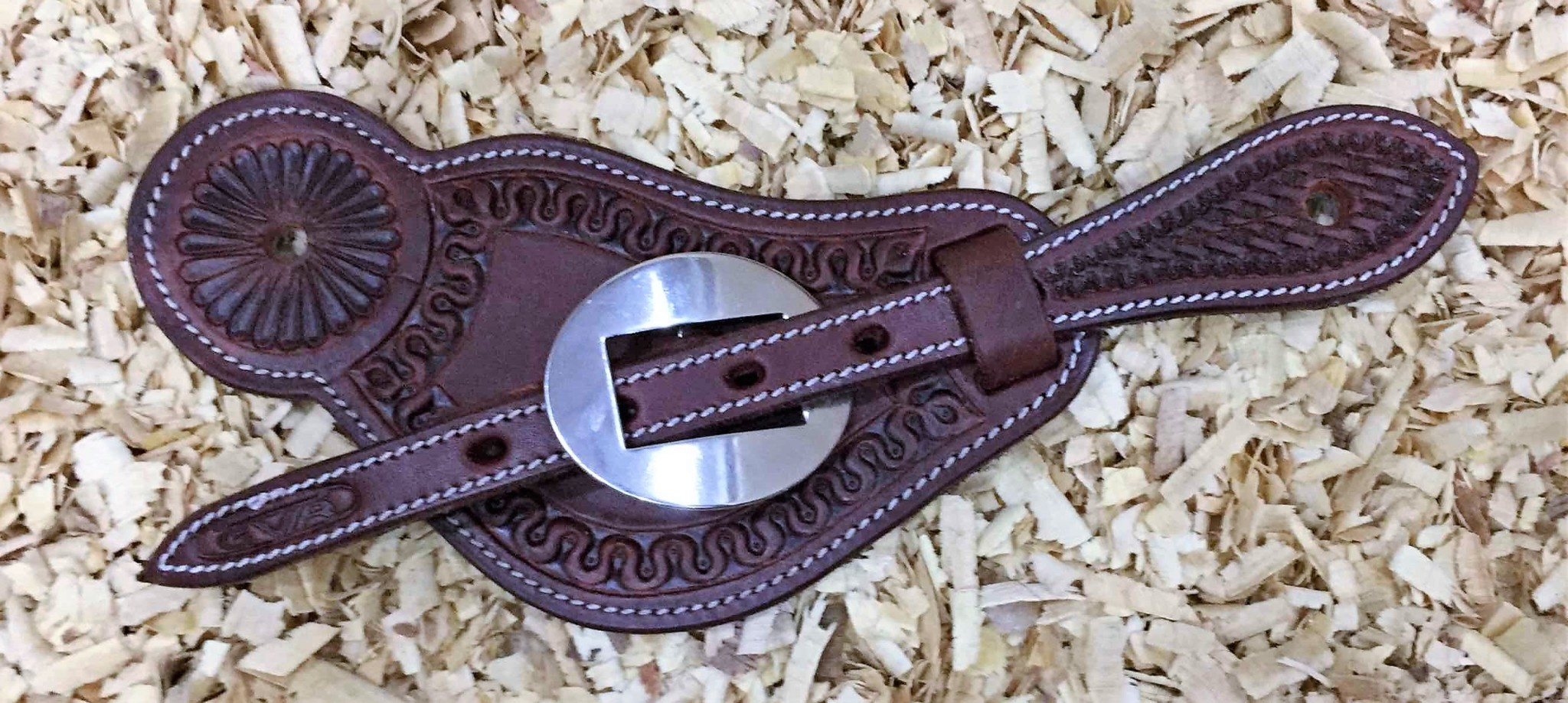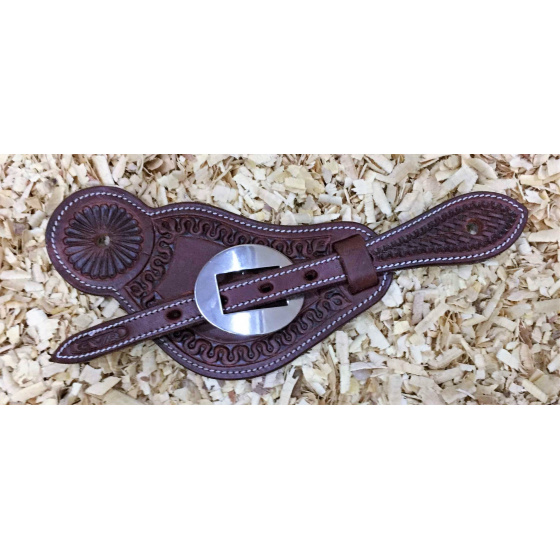 Westernové kožené řemínky k ostruhám z vysokojakostní kůže zdobené arabeskem, obšité a podložené telecí kůží. Nerezové kování.