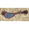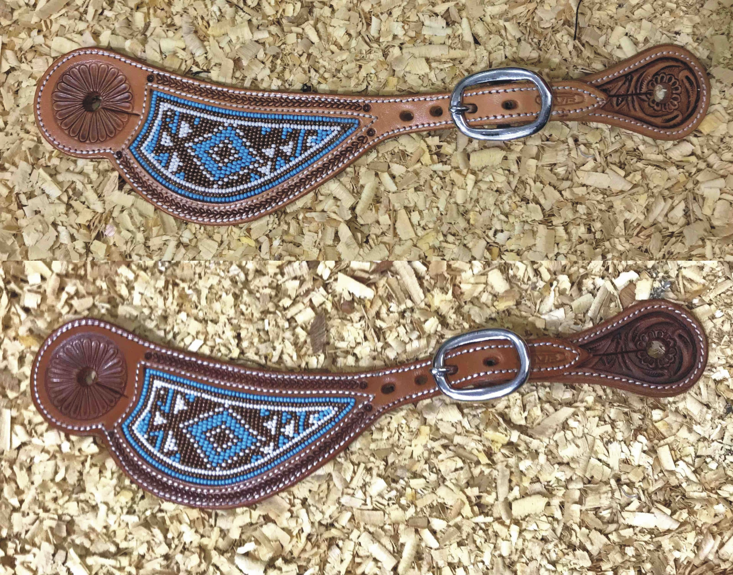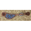 Westernové kožené řemínky k ostruhám zdobené korálky, obšité a podložené telecí kůží, nerezové kování.