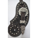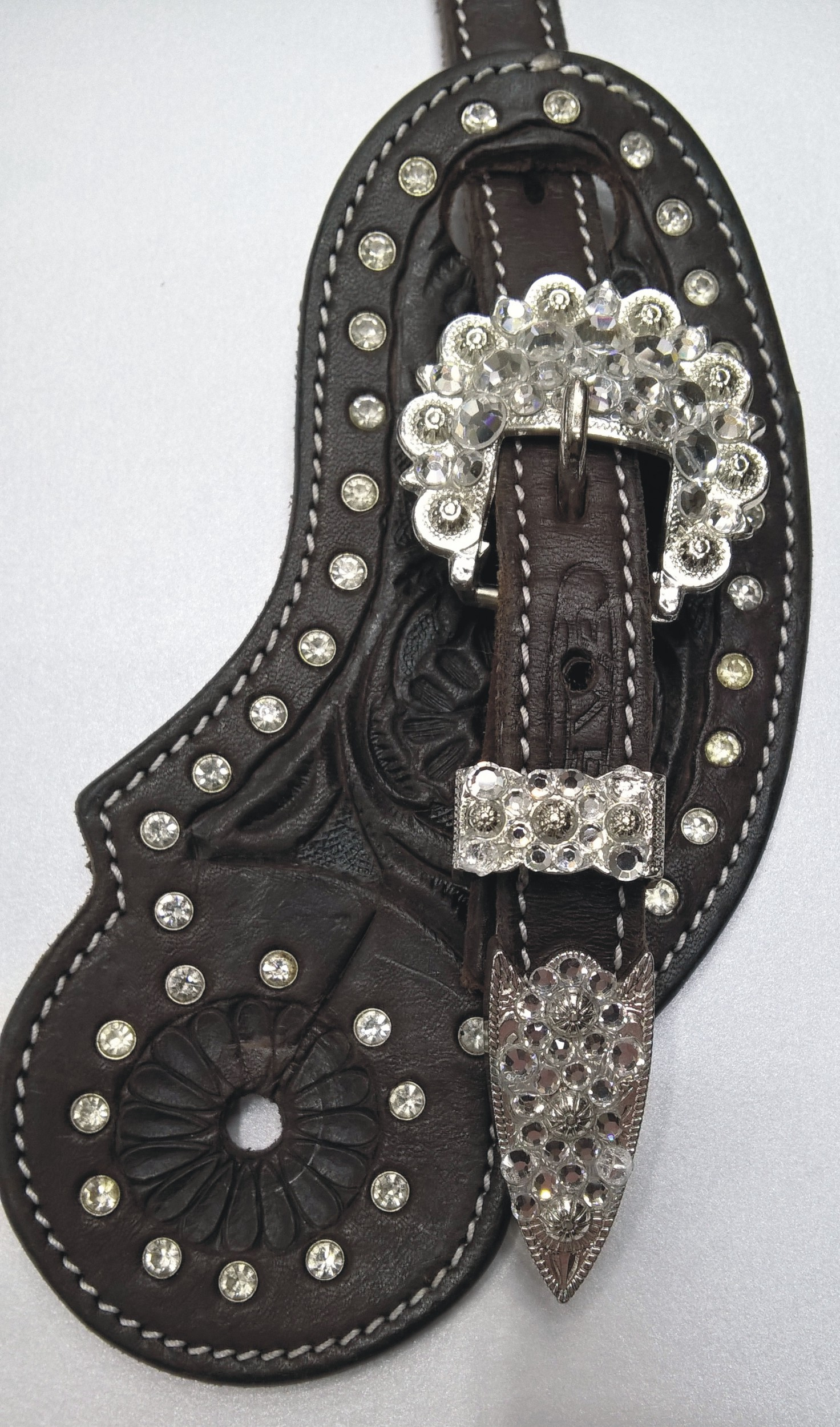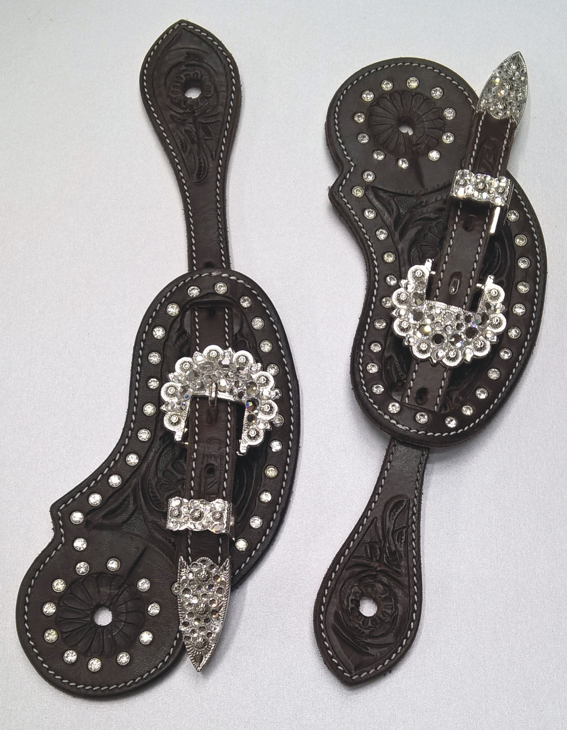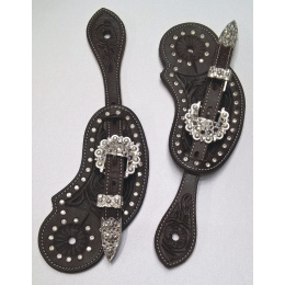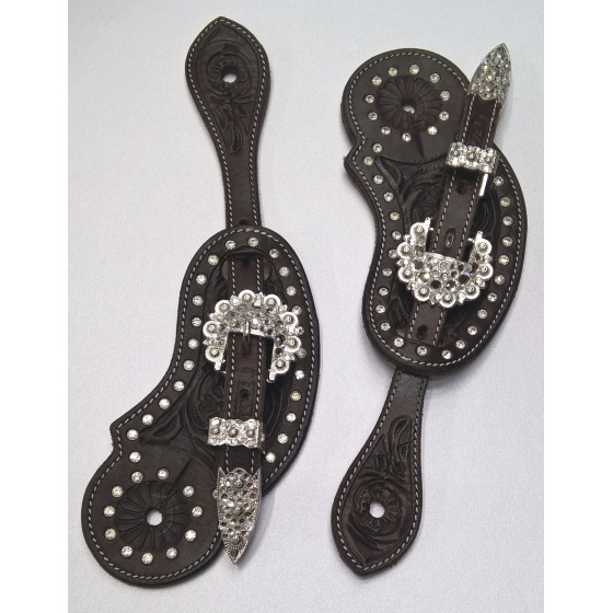 Westernové kožené řemínky k ostruhám zdobené motivy květů a bílými kamínky, stříbrná přezka s kamínky.