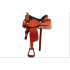 Kožené westernové sedlo obarvené anilinem. Laminátová kostra typu Rooper s nízkou hruškou. Hranaté bočnice s vyraženým vzorem, posedlí potažené měkkou hovězí kůží. Kožené dotahovací řemeny. Dřevěné třmeny s kovovou výstuží potažené kůží. Polstrované polštáře s umělím beránkem. Dodává se bez předního a zadního podbřišníku.stříbrné doplnky