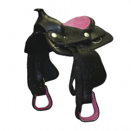 "Westernové syntetické pony sedlo pěkně zdobeno květinovým vzorem, posedlí a třmeny jsou potaženy velurovou kůží, spodní část sedla je potažena černým, umělým beránkem . Sedlo je velice snadno ošetřovatelné, stačí očistit vodou a mýdlem. POZOR - kůži na posedlí je potřeba čistit speciálními přípravky na velurovou kůži.Sedlo je dodáváno včetně neoprenového podbřišníku. Délka podbřišníku: 88cm Délka posedlí: 12"" Barva: černá/růžové posedlí a třmeny"