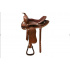 Westernové kožené sedlo postavené na laminátové (Roper) kostře. Sedlo má květinové zdobení, kulaté sukně, měkce podložené posedlí, potažené semišovou kůží, dřevěné třmeny potaženy semišovou i hlazenou kůží, klasické “kravatové“ dotahování a nylonový přední podbříšník.