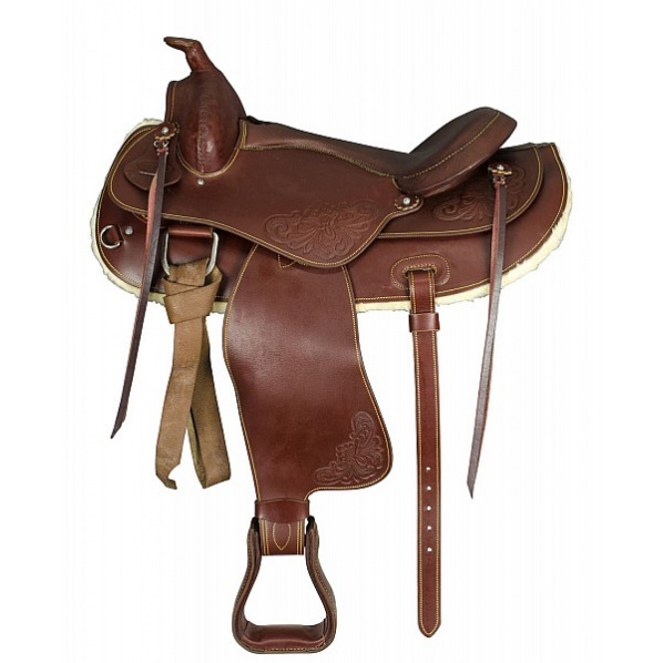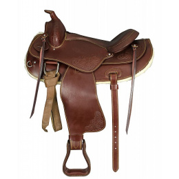 Westernové barrelové sedlo s kulatou sukní. Sedlo je vyrobeno z olejované kůže, posedlí je potaženo jemnou hlazenou kůží, zdobení basketem, podložení umělým beránkem. Sedlo se dodává včetně podbřišníku.