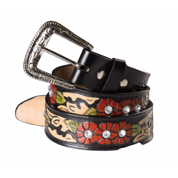 Robustní kožený westernový opasek se zdobením a výměnitelnou přezkou.
