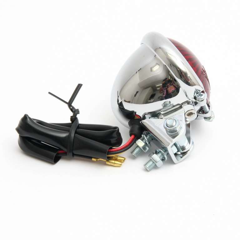 Koncové světlo na motorku OLD SCHOOL, LED dioda, universální, homologované, průměr 60mm, červené sklíčko. Balení 1ks, tvar: kulatý, materiál: slitina, povrchová úprava: chrom nebo černění