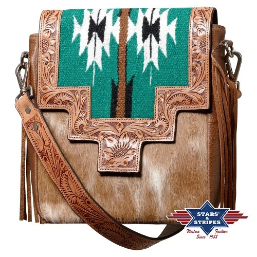 Okouzlující stylová taška přes rameno z ručně tepané kůže a tyrkysové textilní vsadky s odnímatelným ramenním popruhem. Zdobená třásněmi a aztéckými vzory.