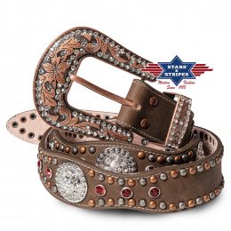 Sexy westernový opasek s vyměnitelnou zdobenou přezkou. Vysoce kvalitní povrchová úprava se zdobením lesklými kamínky a nýty. Vyrobeno z potažené hovězí štípenky.